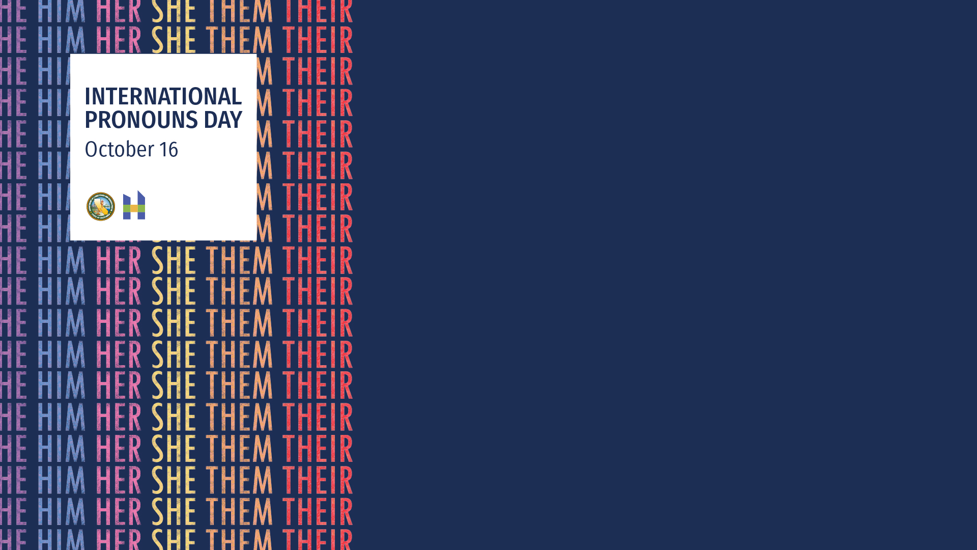 International Pronouns Day began in 2018 and takes place on the 3rd Wednesday of October each year. International Pronouns Day happens each year on the third Wednesday of October. Referring to people by the pronouns they determine for themselves is basic to human dignity and seeks to make respecting, sharing, and educating about personal pronouns commonplace. What Can I Do: Organize an event, workshop, social, or meet n’ greet with pronouns as the focus. Research and learn more about the importance of pronouns and how being referred to by the wrong pronouns particularly affects transgender and gender nonconforming people.